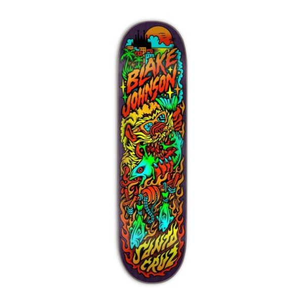 Santa Cruz Skateboards Blake Johnson Beach Wolf Two pro deck featuring art by Tallboy @tallboy666 with spot matte graphic print on 7-ply North American Maple pressed individually using epoxy making a strong, responsive deck with long-lasting pop and consistent concave and kick.